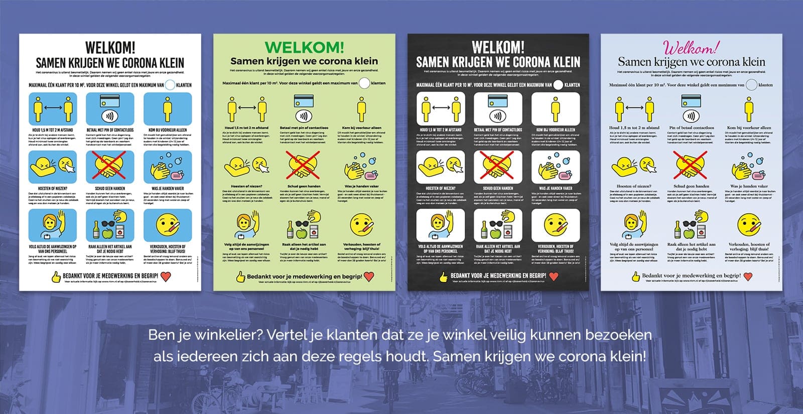 Zelfstandige winkeliers hebben het moeilijk in deze periode van COVID-19. Er zijn weinig mensen op straat en er lijkt ook een zekere aarzeling te zijn om ergens naar binnen te gaan. Laat klanten weten dat jij er alles aan doet om je winkel veilig te houden. Dat ze bij jou verantwoord winkelen. Een duidelijke informatieve raamposter of deurposter met daarop jouw huisregels / deurbeleid / voorzorgsmaatregelen rond de preventie van corona geeft houvast. Ik heb een serie van vier coronaposters ontworpen die je hier gratis kunt downloaden. Je kunt de pdf’s zelf printen of via een printshop / drukkerij laten drukken.